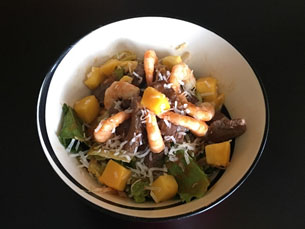 In a large mixing bowl, mix all ingredients except for peanuts, steak, chicken or shrimp. Once all ingredients are mixed and coated with dressing, place grilled steak, chicken or shrimp on top of lettuce mixture, sprinkle with roasted peanuts and drizzle with ¼ cup Thai dressing.