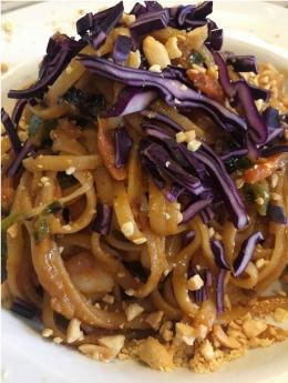 Cook linguini al dente. Once the pasta is cooked, drain well and put back into pot. Stirring over low heat, add the Spicy Thai Peanut Dressing and mix thoroughly. Add sauteed veggies and continue mixing until the thai sauce is heated. Transfer mixture onto a platter and top with red cabbage, bean sprouts, scallions & peanuts. ADD chicken or shrimp if you choose. ENJOY!